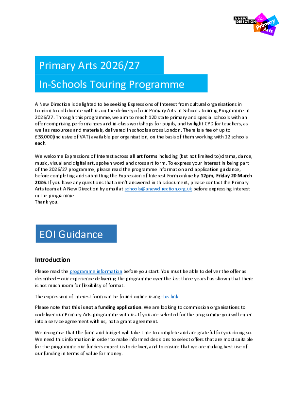 A New Direction is delighted to be seeking Expressions of Interest from cultural organisations in London to collaborate with us on the delivery of our Primary Arts In-Schools Touring Programme in 2026/27.