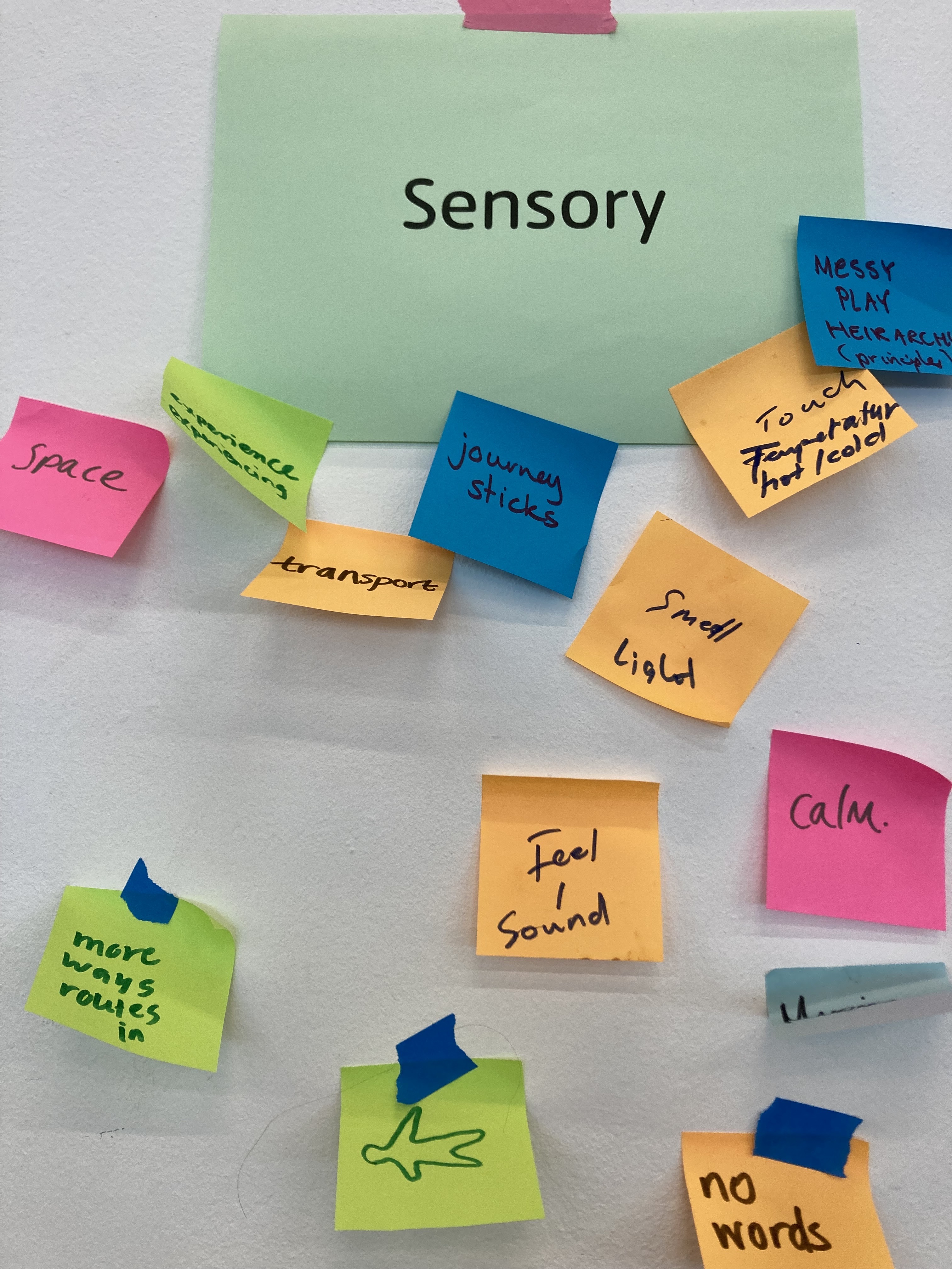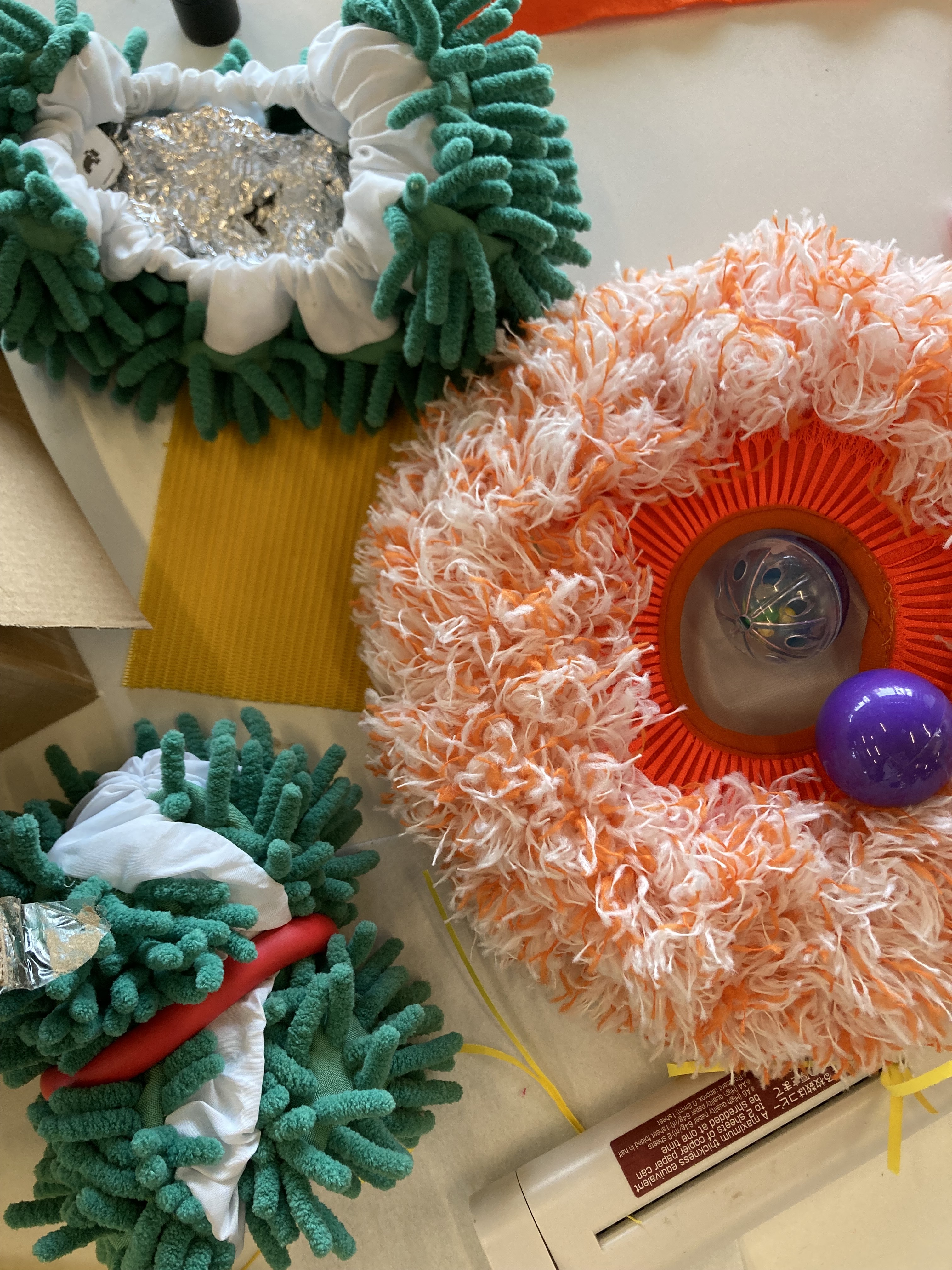 Laid out on a grid on the floor are about a hundred colourful everyday objects. Torches, yarn, pegs, foil, paper, feathers, tape, lolly sticks, shiny stuff, stretchy stuff, stuff with wires coming out. Help yourself. Create an activity that uses some of these items.