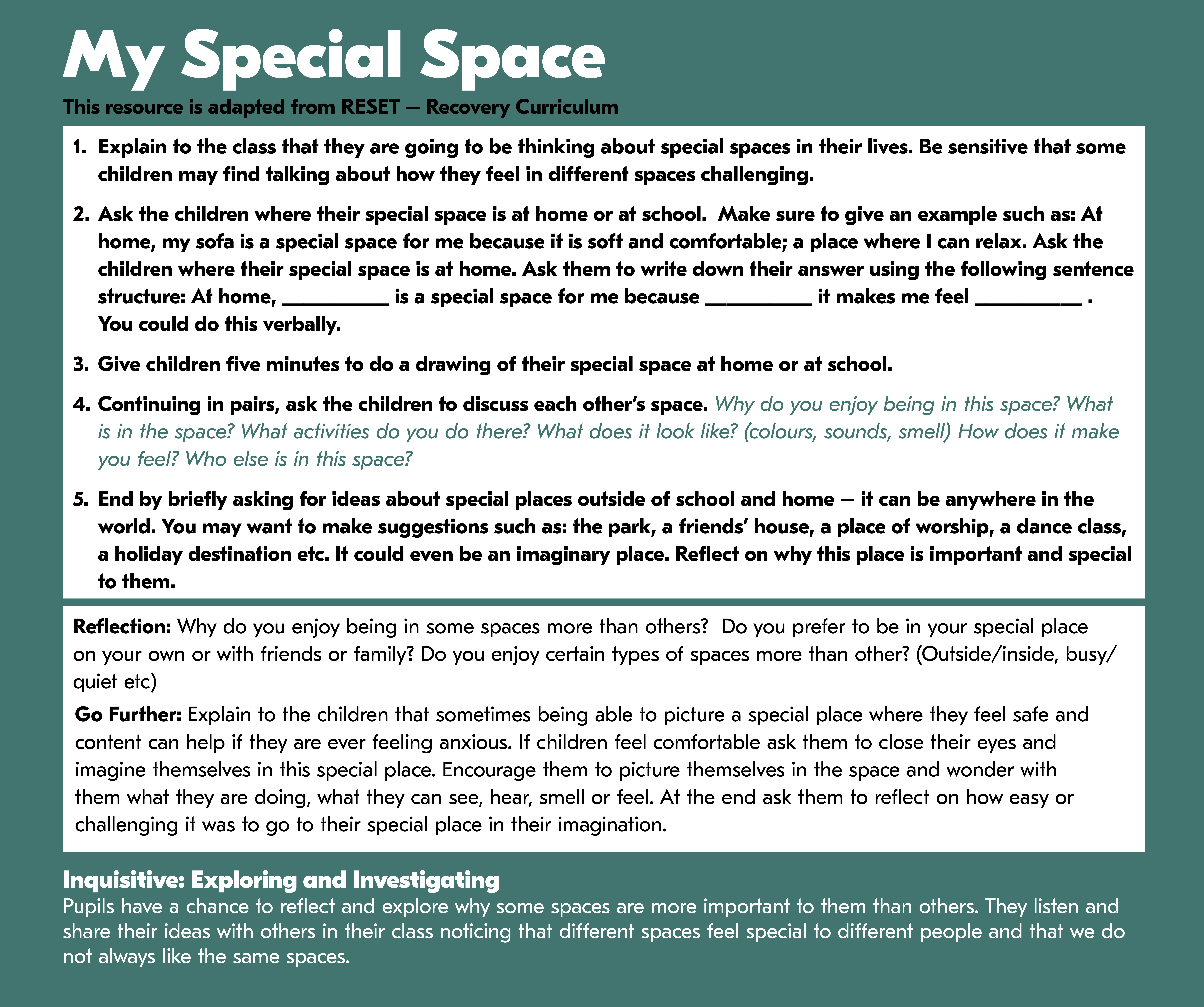 In this activity children are encouraged to question and reflect on which spaces are important to them and why. How do these spaces make them feel? This personal reflection is supported through drawing and partner talk.