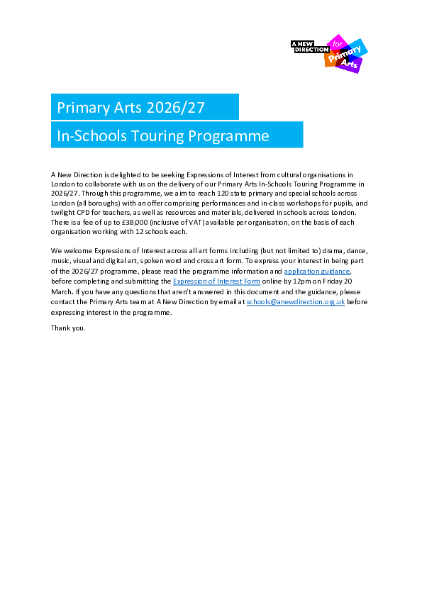 A New Direction is delighted to be seeking Expressions of Interest from cultural organisations in London to collaborate with us on the delivery of our Primary Arts In-Schools Touring Programme in 2026/27.